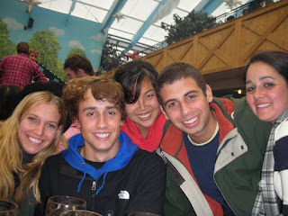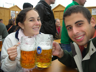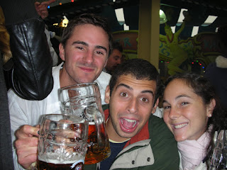 This weekend, Brandon, Andy, Jenny, and I traveled to Munich (Munchen) for Oktoberfest! There were soooo many people there and so much to see - I'm sure I'll forget some things. Anyway, we got there on Friday night pretty late, and checked into our hotel. On the way to the hotel, we saw tons of oktoberfesters on their way home, decked out in all sorts of German attire. Suspenders and shorts and knee socks for the guys, and those low-cut patterned dresses with aprons for the women. Really - all of the Germans were wearing them! And it wasn't just young idiots - a lot of the people we saw were over 40 or 50 and there with their whole families. That was our first taste, but we finally made it to our hotel. It was a 2 person room but there was a king bed and a living room so it worked out perfectly - plus we each basically paid hostel prices since we split it four ways! It was very late so nothing was open except for our hotel bar. We had our first Hefeweisbier (wheat beer) in Munich and some currywurst too. I am DEFINITELY going to start putting curry sauce in my ketchup when I eat hot dogs. I highly recommend it. We went to bed soon after to prepare for our big day.