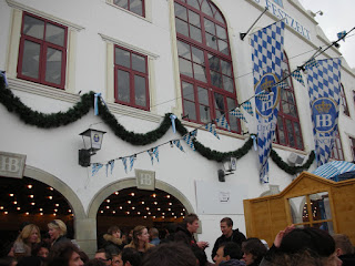 For the rest of the morning we thoroughly enjoyed ourselves, the group of Italians left, and about 8 more came over throughout the next couple of hours. Drinking that early in the morning is very odd. We made good friends with this new group -- I learned all of their names, some new Italian, and they complimented me on my Italian accent. Sergio, Paulo, Paulo, Stefano, Massimo, Rocco, Nicola... I think that's it. Somehow we decided to leave the outside of Hofbrauhaus (we had a pretzel, don't worry) and find some friends in another tent -- Hacker something was next door. So, off to a few more closed doors with mean security guards. By this time we knew any waiting wouldn't be fruitful, so we went around the tent to the back. All of a sudden, we saw it. An open door! There were NO guards in front - just a wide open door with people walking in and out. We couldn't believe it! We were finally inside and didn't even think it was true.