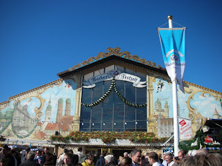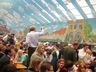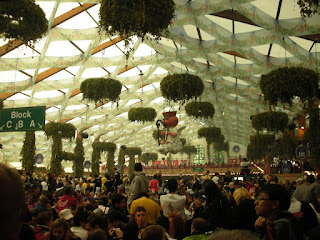 Saturday we woke up crazy early and headed down to Theresienweise (the stop on the U-Bahn where the fairgrounds are). The subway was PACKED with people headed to the festival, and when we got off the train, the platform was absolutely filled - like when you're going to a baseball game at National's Stadium, or when we went to that pro-choice march on the National mall. TONS of people. Keep in mind, this was 7:45 AM!! We were told by some insiders (aka Michael and about.com) that you have to get there very early in order to get into the tents, or else you won't get in and you won't get served. We walked into the fairgrounds with a ton of dressed up Germans around us. It definitely reminded me of the Prince William County Fair - except instead of rednecks it's Bavarian-themed. There are rides, bumper cars, souveniers, and SO much food! Stands with nuts (the candied kind that smell amazing and make you want to buy them), bakery items (particularly, humongous pretzels that are the absolute best thing to eat while/after drinking beer), and a ton of MEAT -- bratwurst (sausage), various schnitzels (fried pork, veal, etc), hendl (roasted chicken - generally half or whole), and even pork knuckle. Ew! The basic set up of the fair is like this: there are about a dozen huge "tents," each owned by a different restaurant. They are HUGE on the inside - like 2 stories and 5000 seats at least. Just rows and rows of picnic tables. There are also smaller tents with just 30 tables or so, but we didn't go into any of them. Anyway, it's really hard to get into any of the tents without a reservation (which Germans make like 2 years in advance if they're really into it), so that's why we had to get there so early. You either make it in in the morning when the doors open, or you're out for the majority of the day.