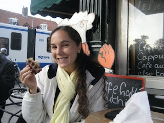 The girls by a canal (Dalila, Jenny, and me)The entire city is walkable - we never even needed to take public transportation. It is pretty touristy in a lot of areas, but that makes for some competitive prices on food! We ate SO much - traveling really makes you realize how bad English food is. French fries, waffles, Dutch pancakes, Indonesian food, Argentinian Steakhouses, Falafel -- basically we just ate the entire time. The waffles there are unbelievable. In any bakery or sandwich shop you could find these delicious fresh waffles with different chocolate toppings, and most places you could get them heated up with whipped cream or ice cream. Here's Jenny with a chocolate covered one -